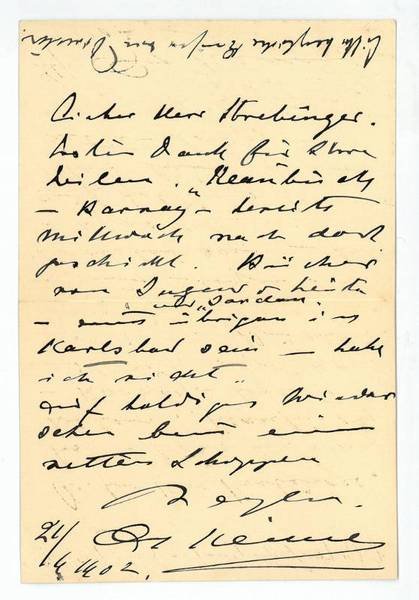 1 S. 8vo. Dankt dem Schauspieler Julius Strebinger und freut sich "auf baldiges Wiedersehen bei einem netten Schoppen".