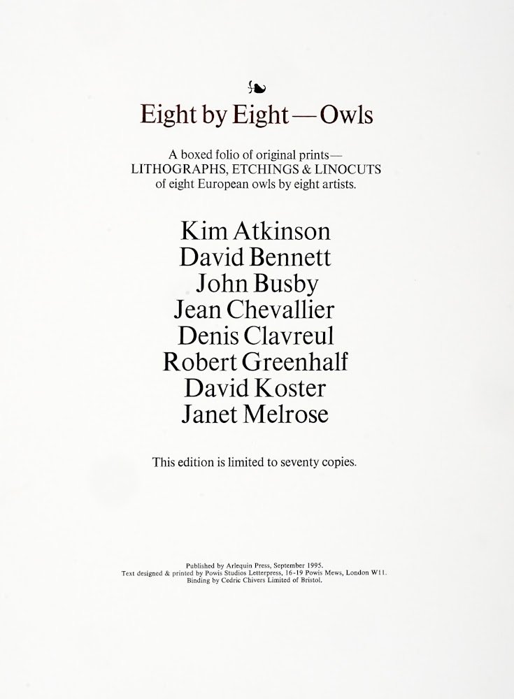 Eight by Eight. A boxed folio of original prints – lithographs, etchings & linocuts of eight European owls by eight artists