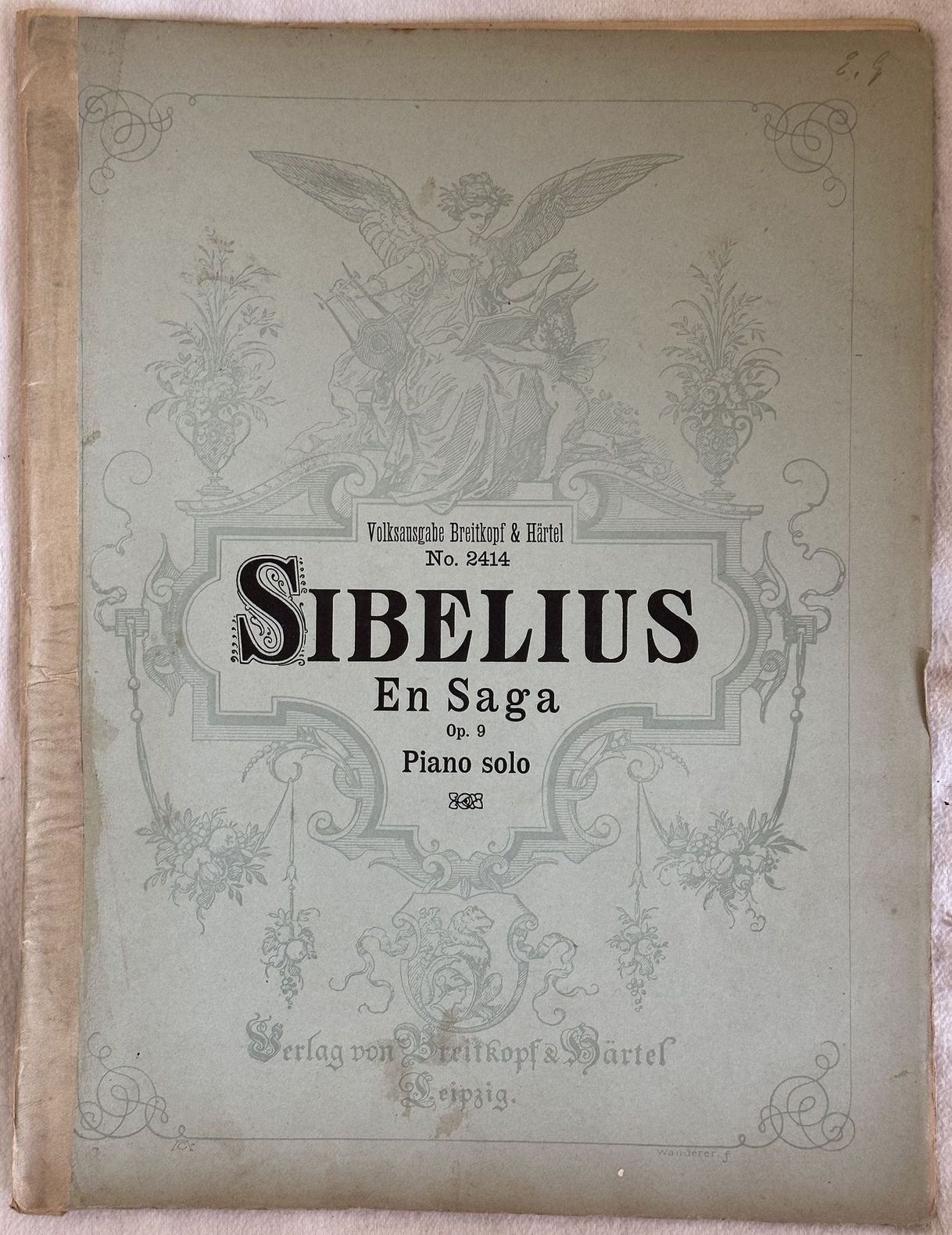 Edizione del 1908 di questa melodia per pianoforte "En saga" del compositore finlandese Jean Sibelius (1865-1957), dall'opera 9. In buone condizioni. Copertina editoriale in buone condizioni con lievi usure marginali. Legatura in buone condizioni. Pagine in buone condizioni con rare fioriture. In folio. cm. 31,5x23,5. Pp. 29.Edition of 1908 of this melody for piano "En saga" by the finnish composer Jean Sibelius (1865-1957), from the opera 9. In good conditions. Editorial cover in good conditions with lightly worn in the extremities. Binding in good conditions. Pages in good conditions with occasional foxing.In folio. cm. 31,5x23,5. Pp. 29.