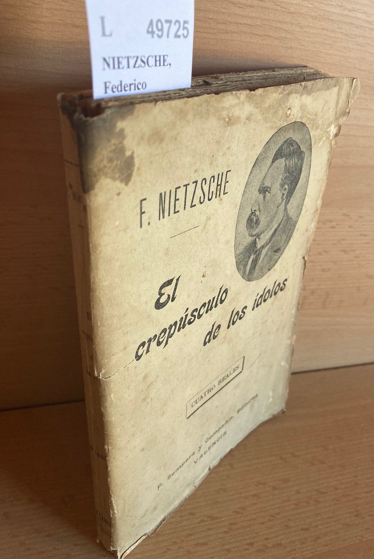 NIETZSCHE, Federico EL CREPUSCULO DE LOS IDOLOS O COMO SE FILOSOFA AL MARTILLO Sempere y Compañia. Valencia 1910 185 p. (19 cm) Enc. rustica. Deslucido. Manchas de humedad en tapas. L (Ref.49725) filosofia rito apolineo y dionisiaco
