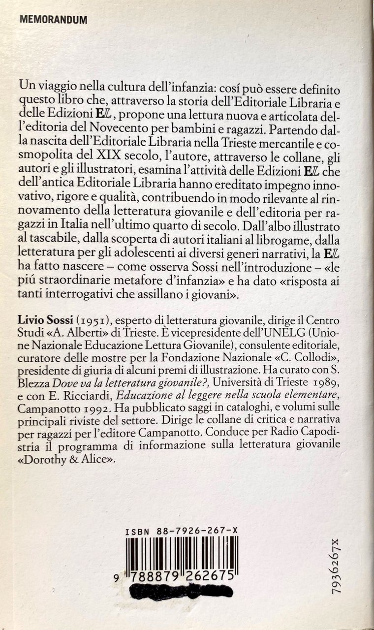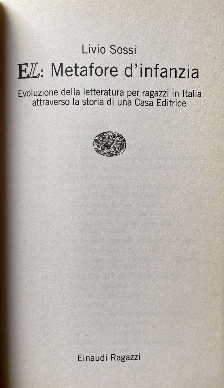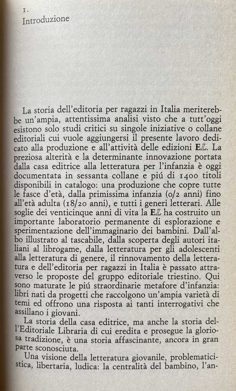 Un viaggio nella cultura dell'infanzia: così può essere definito questo libro che, attraverso la storia dell'Editoriale Libraria e delle Edizioni EL, propone una lettura nuova e articolata dell'editoria del Novecento per bambini e ragazzi. Partendo dalla nascita dell'Editoriale Libraria nella Trieste mercantile e cosmopolita del XIX secolo, l'autore, attraverso le collane, gli autori e gli illustratori, esamina l'attività delle Edizioni EL che dell'antica Editoriale Libraria hanno ereditato impegno innovativo, rigore e qualità, contribuendo in modo rilevante al rinnovamento della letteratura giovanile e dell'editoria per ragazzi in Italia nell'ultimo quarto di secolo. Dall'albo illustrato al tascabile, dalla scoperta di autori italiani al librogame, dalla letteratura per gli adolescenti ai diversi generi narrativi, la EL ha fatto nascere come osserva Sossi nell'introduzione, le più straordinarie metafore d'infanzia e ha dato risposta ai tanti interrogativi che assillano i giovani.