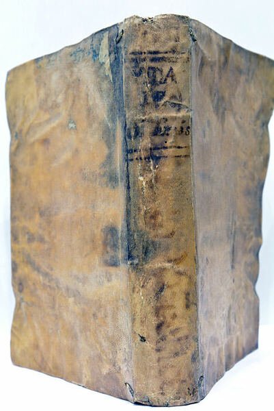 20 feuillets. Portrait. 375 pages. (i.e. 379). 22 feuillets. (20x15 Cm). Plein vélin du temps. Dos lisse titré à l'encre brune. Traces de liens. Quelques salissures, taches et rousseurs. Mouillure angulaire couvrant l'ensemble du volume. Petit travail de vers dans la marge intérieure de quelques feuillets, sans atteinte au texte. Edition imprimée à Salamanque, de l'une des premières monographies en espagnol consacrées à Saint Thomas d'Aquin, par Tomas de Granda, prêcheur au couvent dominicain de Bilbao. Rédigé en chapitres ordonnés chronologiquement, l'ouvrage retrace la vie et l'œuvre du "Docteur angélique", lequel exerça une immense influence sur la pensée de grandes figures espagnoles. Nombreuses notes aux marges et dotée d'un indice détaillé en fin de texte. L'ouvrage est illustré d'après l'artiste barcelonais Ignasi Valls. Vignette gravée au titre. Portrait de Saint Thomas en frontispice. La page 139, entièrement gravée, représente un calligramme en forme de croix. Nombreux culs-de-lampe.