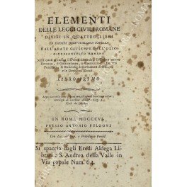 Elementi delle leggi civili romane. Divisi in quattro libri ed esposti nell'italiana favella. Nelli quali s'indica il Dritto Naturale, il Dritto Antico Romano, il Giustinianeo, le Costituzioni, Decreti Pontificj, le Rubriche dello Statuto di Roma, e le Decisioni Rotali