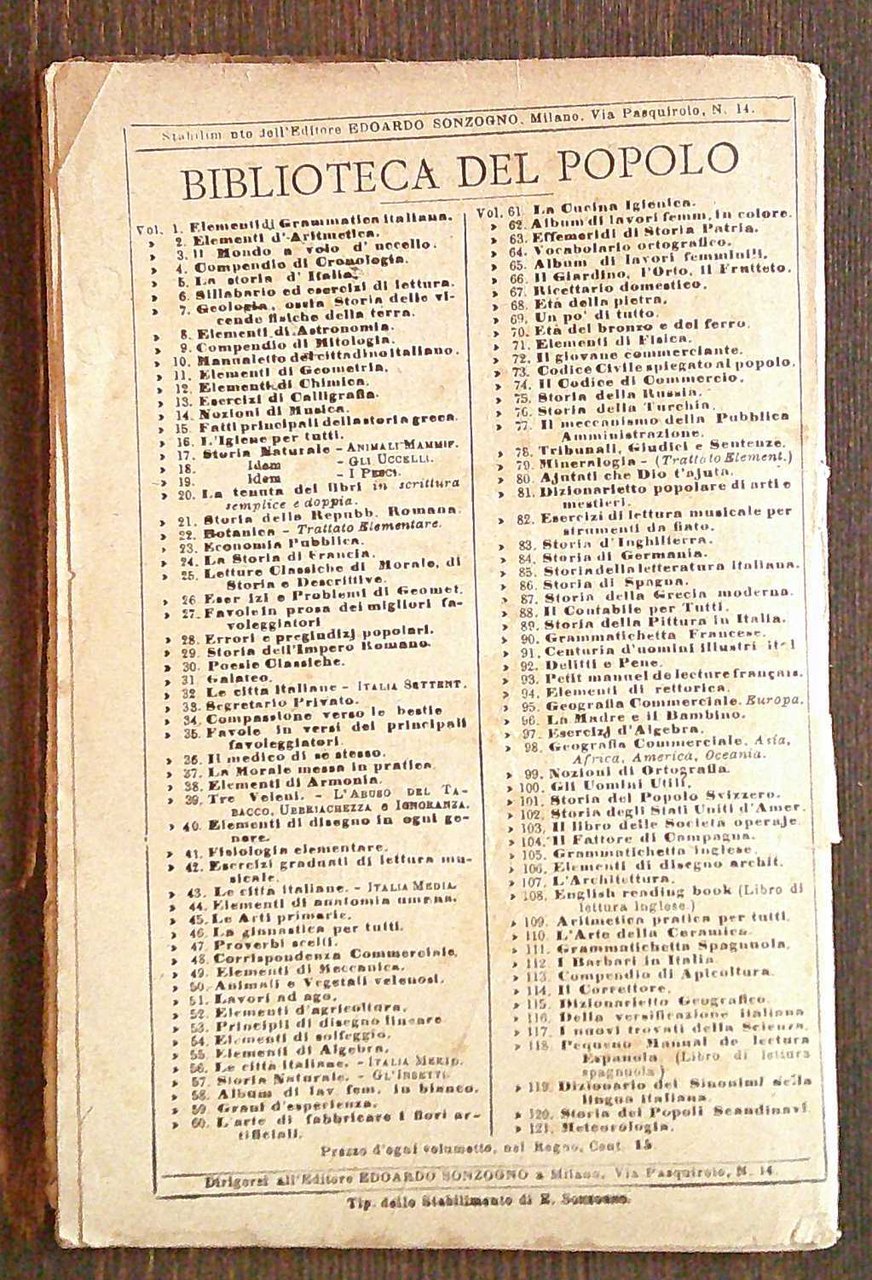 Collana Biblioteca del Popolo Vol. N.8. Propaganda d'Istruzione. Ed. Edoardo Sonzogno - Milano, 1882. Brossura editoriale con minime imperfezioni al dorso. 11x16; pp.63. Ottimo stato. , Ottimo (Fine)