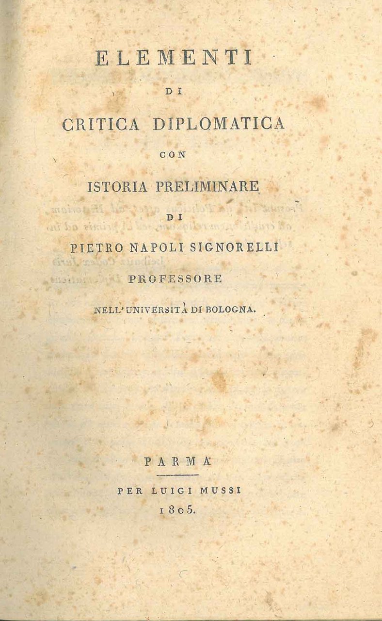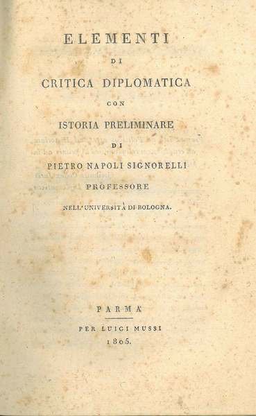 Elementi di critica diplomatica con istoria preliminare di Pietro Napoli Signorelli professore nell'università di Bologna. Primo volume di quattro