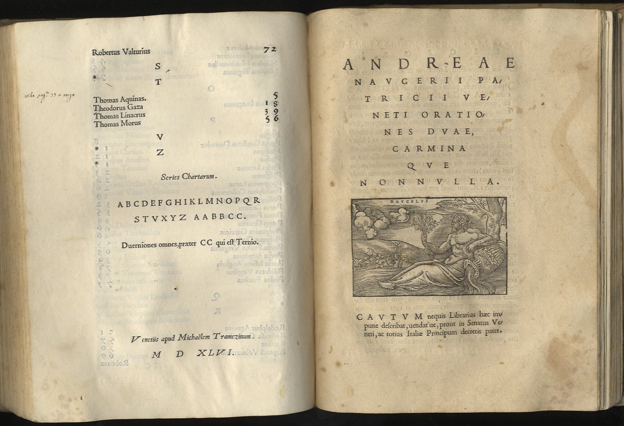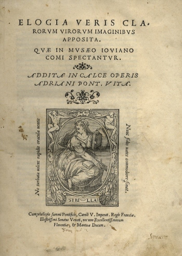 Elogia veris clarorum virorum imaginibus apposita. Quae in Musaeo Ioviano Comi spectantur. Addita in calce operis Adriani Pont. vita. Venetiis, apud Michaelem Tramezinum, 1546. [Legato con:] NAUGERIUS A. Orationes duae, carminaque nonnulla. Impressum Venetiis amicorum cura [.] Praelo Ioan. Tacuini, 1530.