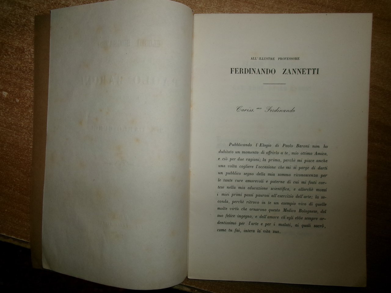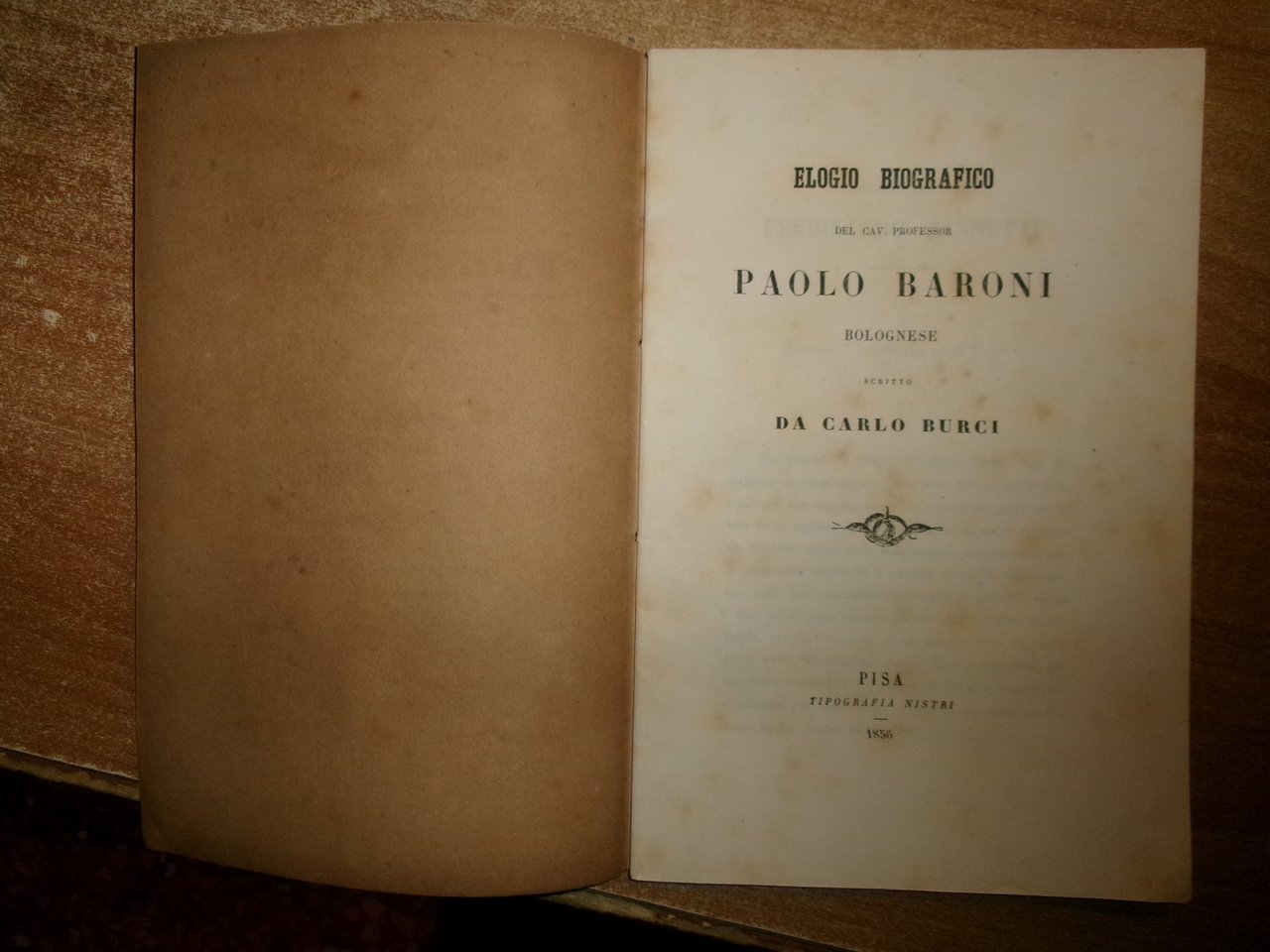 Scritto da CARLO BURCI. Pisa, Tipografia Nistri, 1856. Elogio Biografico del Cav. Professor PAOLO BARONI Bolognese. In-8°, br. orig. 33, (1) pp. Neg. mob. 2 entro busta trasp.