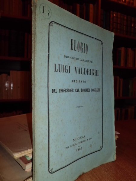 Bosellini, Lodovico. Modena, tip. N. Zanichelli, 1865. Elogio del conte cavaliere Luigi Valdrighi recitato nella inaugurazione degli studi nella Università modenese il 15 Novembre 1862. In - 8°, br., cop. orig. 234 pp. con Albero genealogico della famiglia Valdrighi ripiegato f.t. in fine. Ben conservato. Neg. Mob. 4.