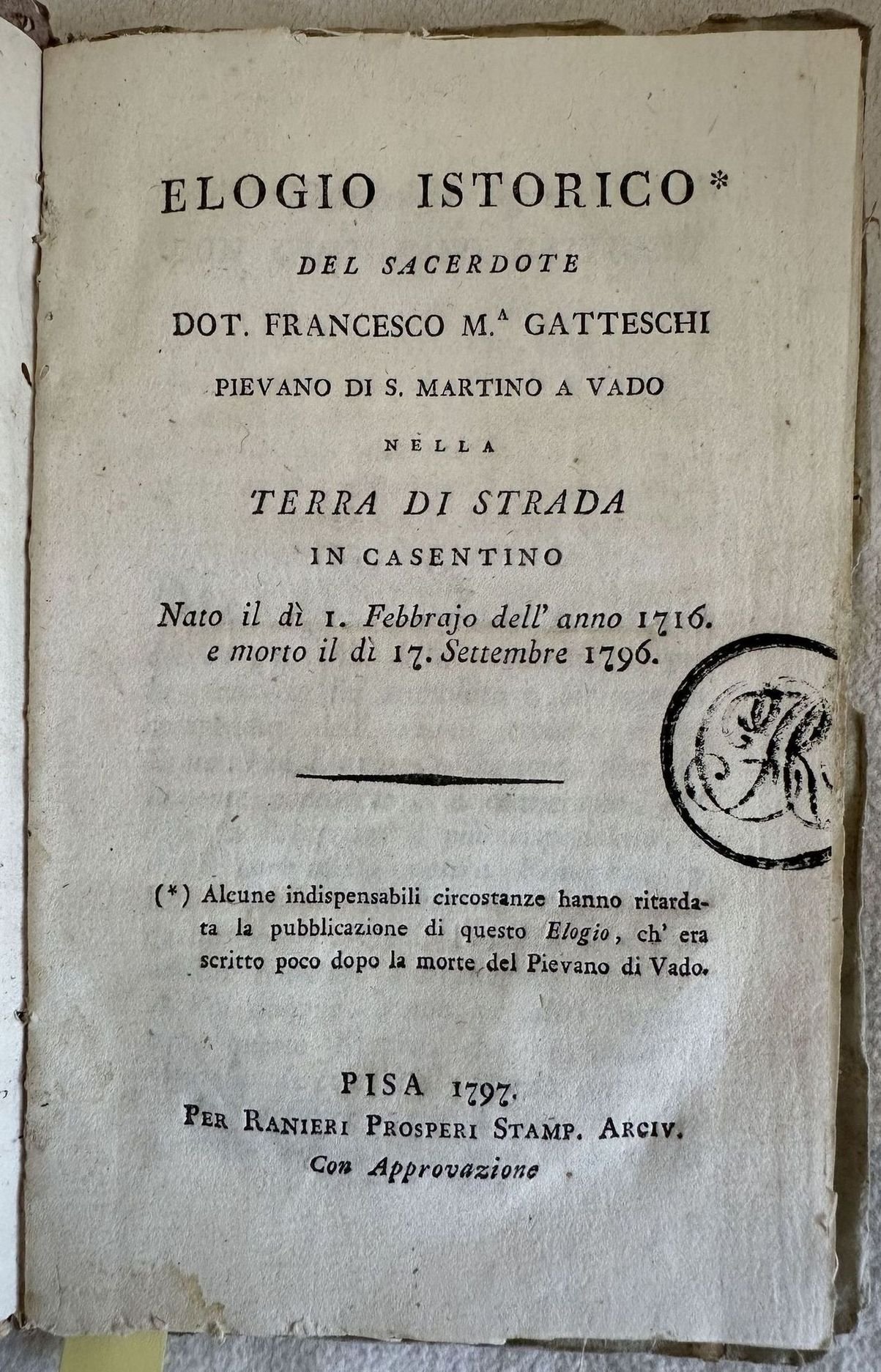 ELOGIO ISTORICO DEL SACERDOTE DOT. FRANCESCO M. GATTESCHI PIEVANO DI S. MARTINO A VADO NELLA TERRA DI STRADA IN CASENTINO NATO IL DI 1 FEBBRAIO DELL'ANNO 1716 E MORTO IL DI 17 SETTEMBRE 1796