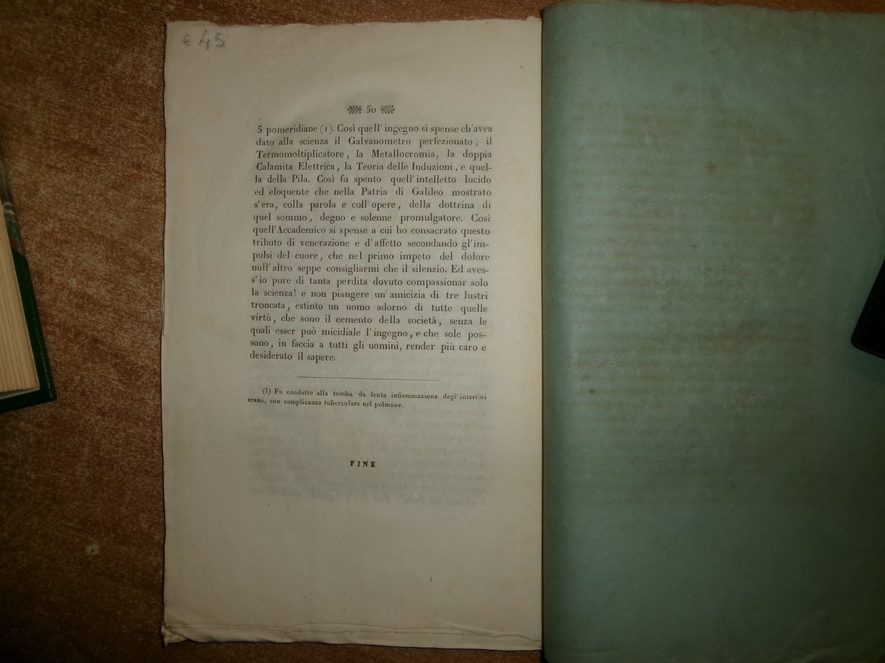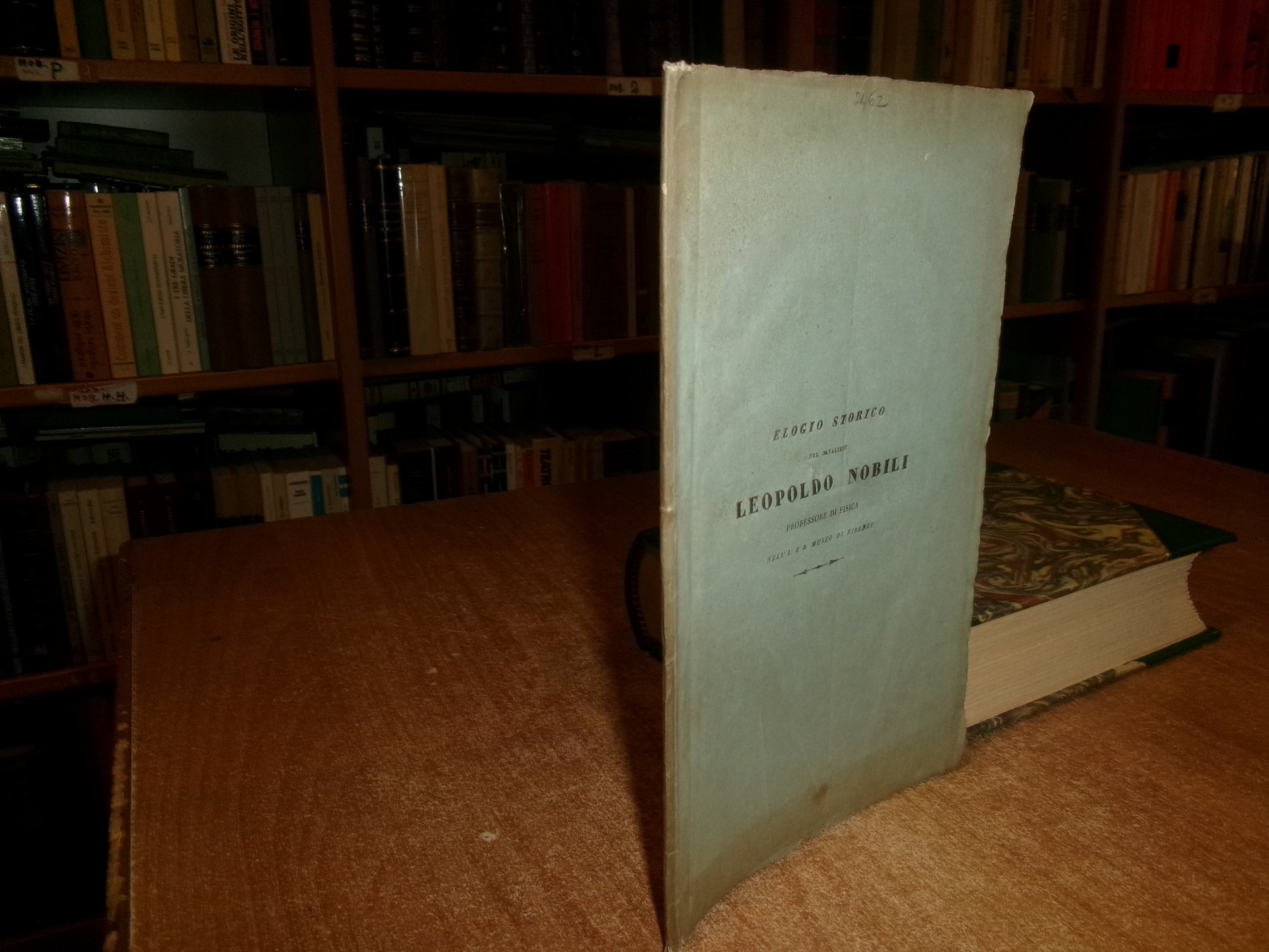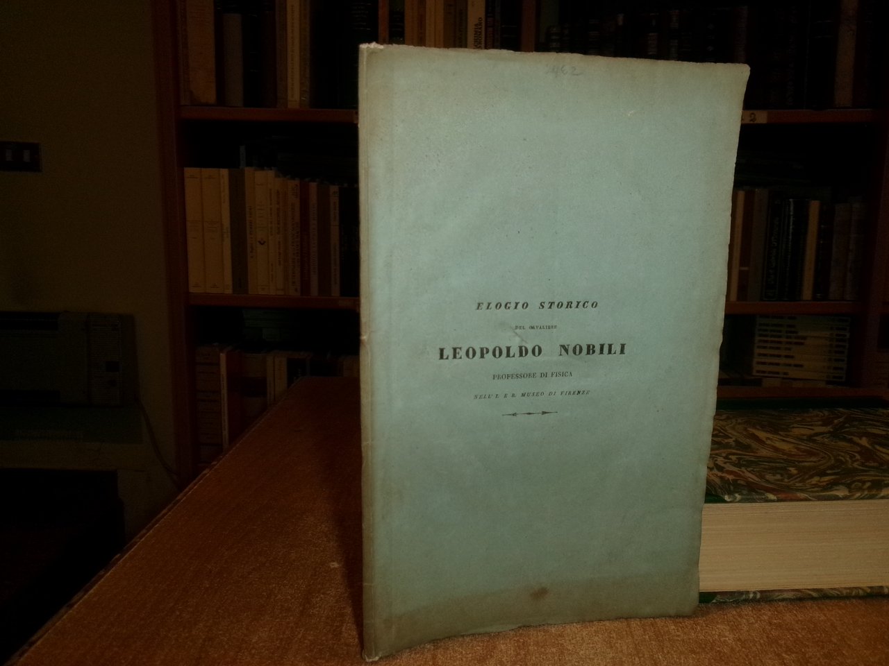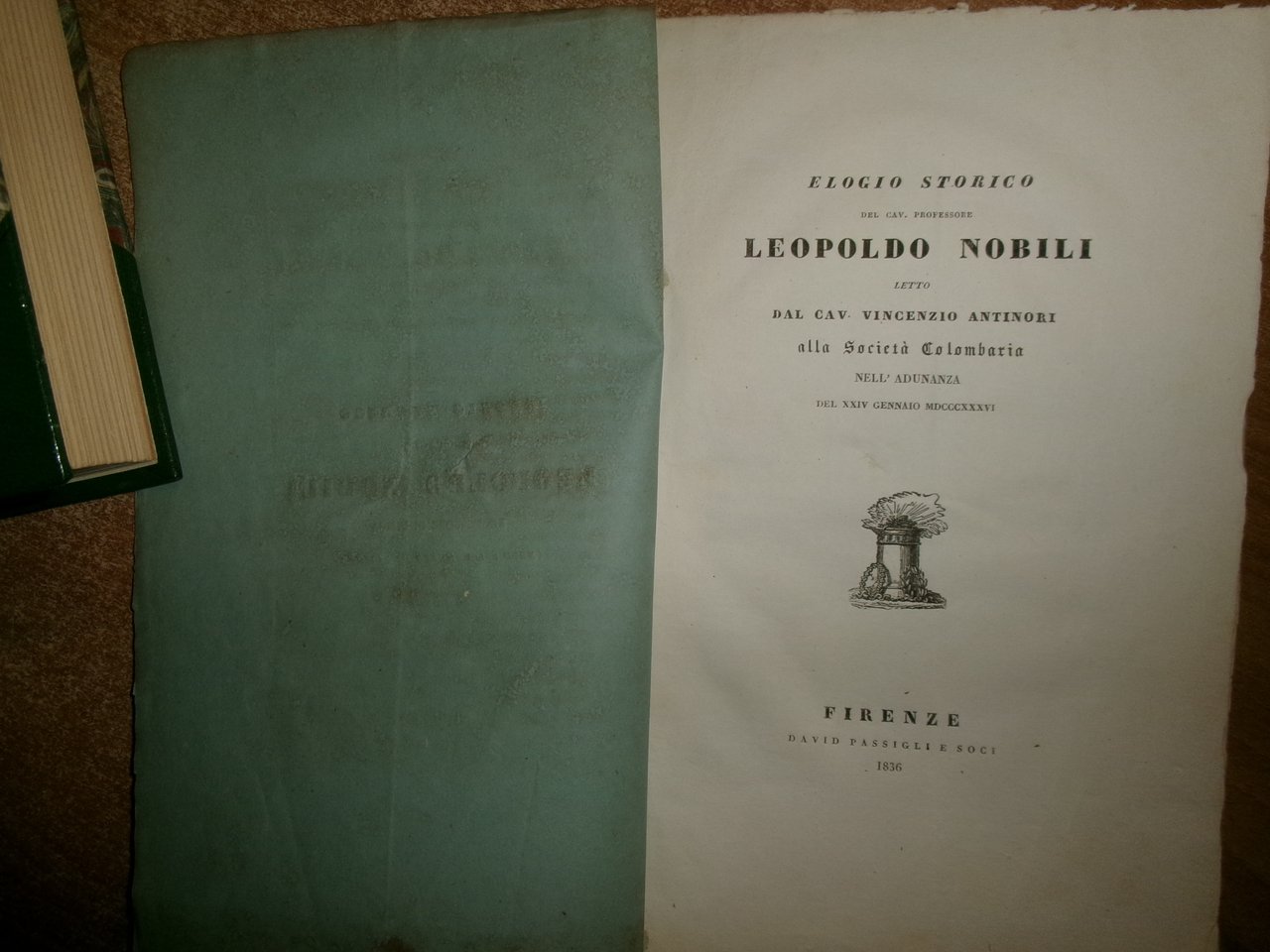 Del Cav. Professore LEOPOLDO NOBILI. Firenze, David Passigli e Soci, 1836. Elogio Storico del Cavaliere LEOPOLDO NOBILI letto dal Cav. Vincenzio Antinori alla Società Colombaria nell' Adunanza del XXIV Gennaio MDCCCXXXVI. In-8°, br. orig. 50 pp. Opuscolo ottimamente conservato con barbe. Neg. Mob. 11 entro busta trasp.