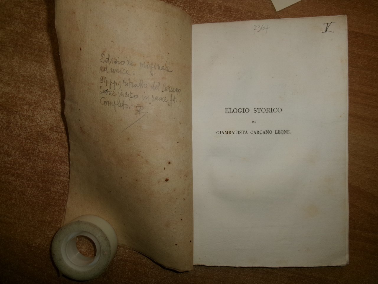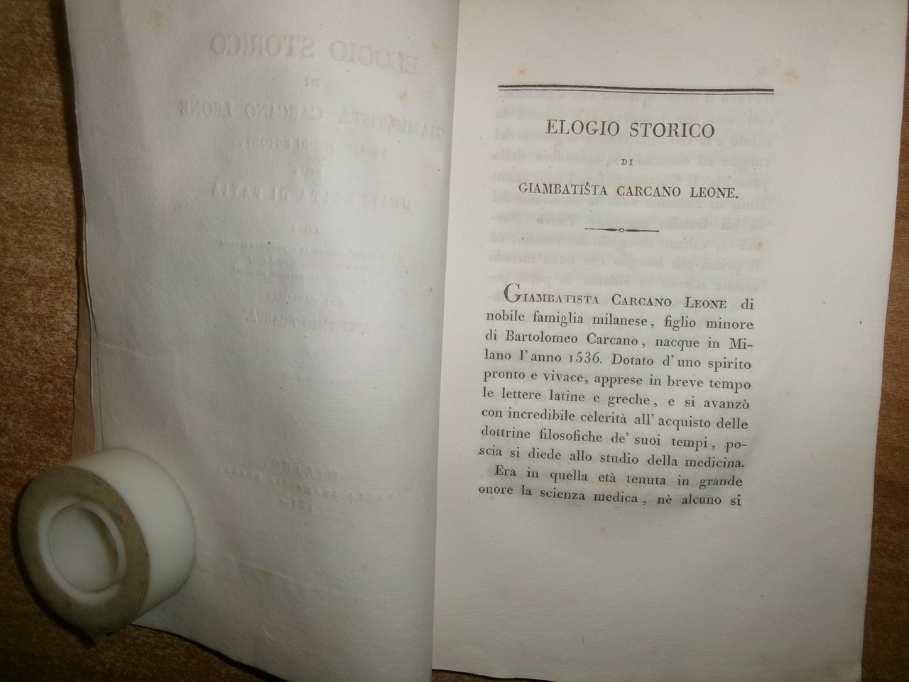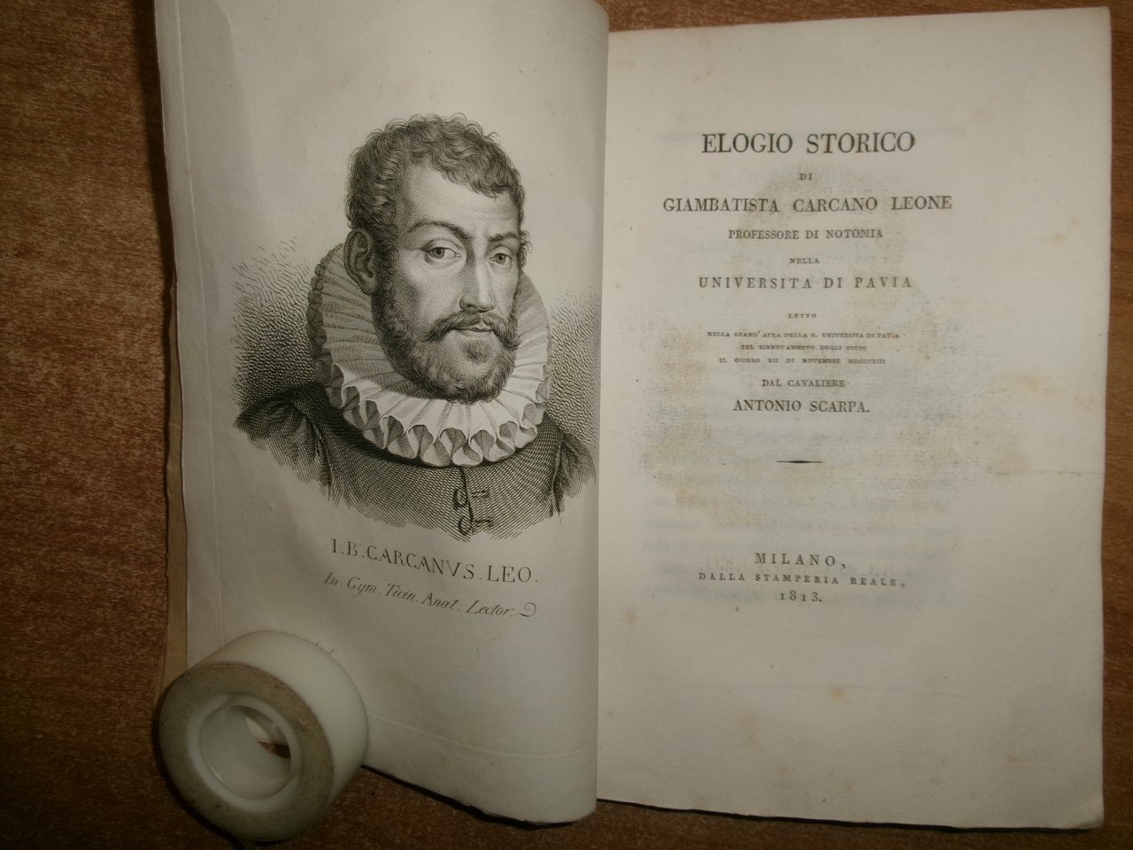 ELOGIO STORICO DI GIAMBATTISTA CARCANO LEONE professore di Notomia nella università di Pavia, letto (...) dal cavaliere Antonio Scarpa. Milano, dalla stamperia reale, 1813. In-8°, br. colorata coeva. 84 pp., ritratto del Carcano Leone inciso in rame f.t. Edizione originale ed unica. Completo. Neg. mob. 16 entro busta trasp.
