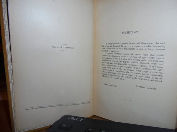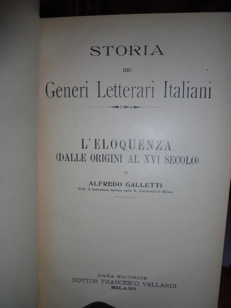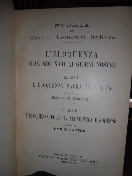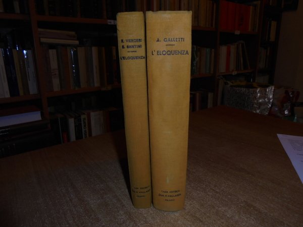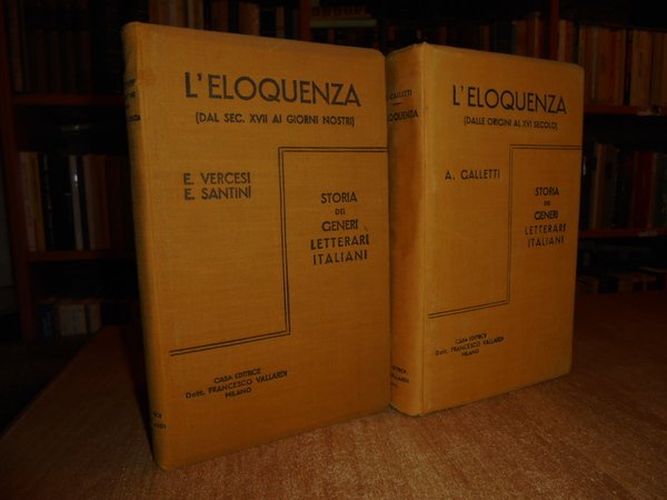 Alfredo, Galletti. Ernesto, Vercesi. Emilio, Santini. Milano, Casa Editrice Francesco Vallardi, 1931/38. Storia dei generi letterari italiani. L' ELOQUENZA (Dalle origini al XVI secolo). (Dal secolo XVII ai giorni nostri). 2 volumi in-8°, tela orig. xi, 654 pp.; viii, 352 pp. Opera completa ben conservata. Uff. A - II - 2