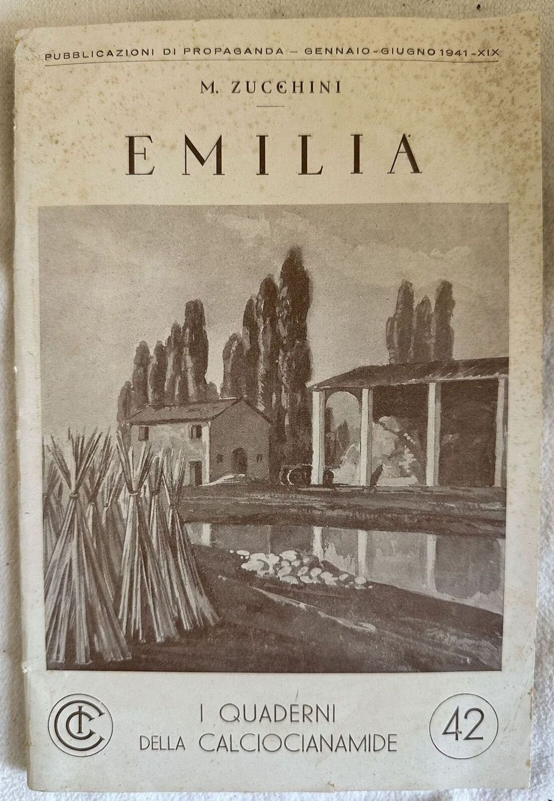 Interessante pubblicazione di agricoltura del 1941 sull'Emilia di Zucchini. All'interno: I terreni, Caratteristiche dell'agricoltura, Le bonifiche e l'irrigazione, La concimazione e l'impiego della calciocianamide, Le formule di concimazione da adottarsi per le varie colture (grano e cereali minori, granoturco, canapa, bietola da zucchero, riso, pomodoro, patata, porati artificiali, erbai, vite, piante fruttifere ec. Alcune fotografie: ferrarese, mappe, macerazione rustica della canapa, vari tipi di coltivazione. In buone condizioni. Copertina editoriale in buone condizioni generali con lievi usure ai margini e dorso. Legatura in buone condizioni. Pagine in buone condizioni con rare fioriture. In 8. cm 22x14,5. Pp. 40.Interesting pamhlet of agriculture of 1941 about Emilia by Zucchini. Inside: soils, drainage, fertilisation, usage in different cultivation. Some photographies: ferrarese, mappe, macerazione rustica della canapa, vari tipi di coltivazione. In good conditions. Editorial cover in good conditions lightly worn in the extremities. Binding in good conditions. Pages in good conditions with occasional foxing. In 8. cm 22x14,5. Pp. 40.