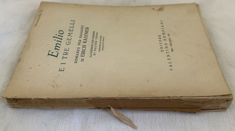 Edizione del 1936 di questo delizioso romanzo per ragazzi di Erich Kastner. All'interno sono presenti numerose illustrazioni di Walter Trier. Versione italiana di Lavinia Mazzucchetti. In discrete condizioni. Copertina assente. Legatura in discrete condizioni con le ultime tre pagine allentate. All'interno le pagine si presentano in buone condizioni con rare fioriture. In 8. Dim. 24x16 cm. Pp. 257+(5).Edition of 1936 of this nice novel for teenagers by Erich Kastner. Different illustrations by Walter Trier. Italian version by Lavinia Mazzucchetti. In fair conditions. Carton is missing. Binding in fair conditions with the last three pages partially detached. Inside pages are in good conditions with occasional foxings. In 8. Dim. 24x16 cm. Pp. 257+(5).
