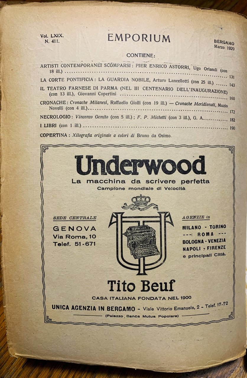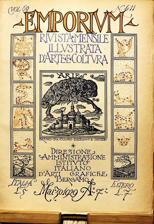 I ed. della rivista mensile illustrata d'arte e coltura Emporium (Vol. LXIX - N. 411 - Marzo 1929-VII). Direzione e Amministrazione: Bergamo, Istituto Italiano d'Arti Grafiche Editore. VIII grande/ (18) pubblicitarie anche illustrate in b/n e a colori+129-192/ brossura in cartoncino ruvido avorio con titoli a colori e con xilografie a colori ai piatti di Bruno da Osimo (Bruno Marsili). Con illustrazioni in b/n nel testo e in tavole f.t. protette con carta velina. Stato buono (lieve usura della copertina - copertina e pagine leggermente brunite). Contenuto: Artisti contemporanei:Artisti contemporanei scomparsi: Pier Enrico Astorri; Ugo Orlandi (con 18 ill.) - La Corte Pontifficia: La Guardia Nobile; Arturo Lancellotti (con 25 ill.) - Il Teatro Farnese di Parma (nel III Centenario dell'inaugurazione); Giovanni Copertini (con 13 ill.) - Cronache (Cronache Milanesi; Raffaello Giolli (con 19 ill.) - Cronache Meridionali; Muzio Novelli (con 4 ill.) - Necrologio (Vincenzo Gemito (con 5 ill.) - F. P. Michetti (con 3 ill.); G. A. - I libri (con 1 ill.)).