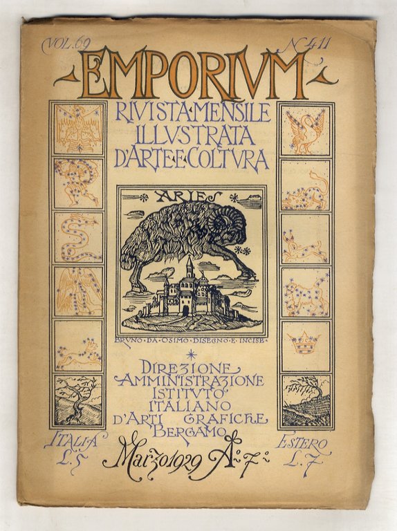 Bergamo, Istituto Italiano d'Arti Grafiche, 1929, un fascicolo, in-4 piccolo, bella brossura editoriale con la copertina anteriore illustrata in xilografia a colori da Bruno da Osimo (una rappresentazione dello Zodiaco), pp. XVIII di pubblicità, numerate da 129 a 192. Con una tavola f.t. e numerose illustrazioni n.t. Bruno da Osimo è stato uno dei maggiori xilografi italiani del Novecento.