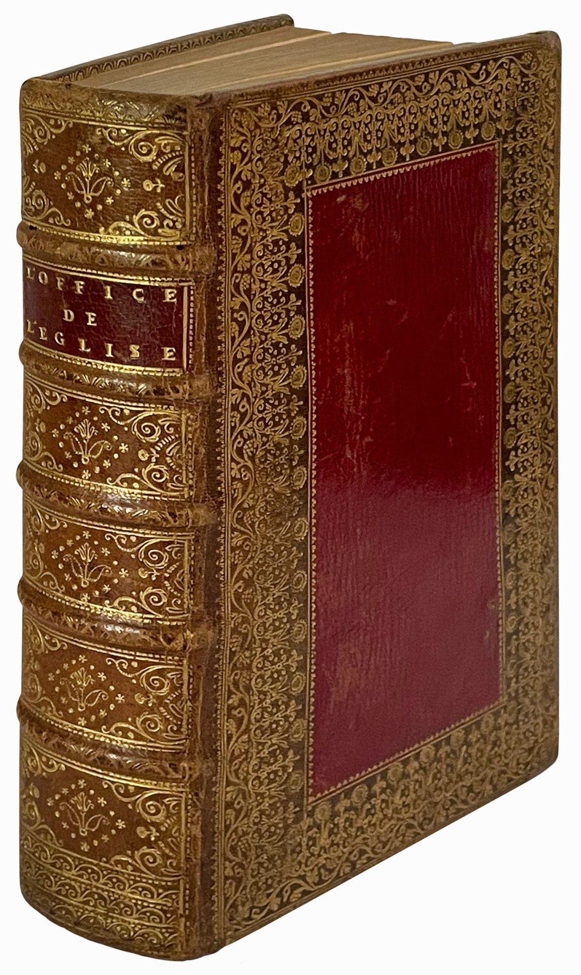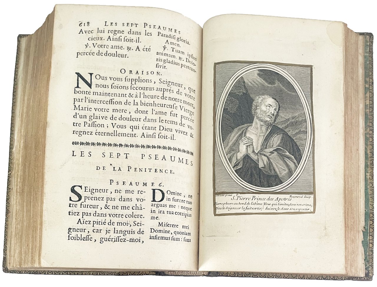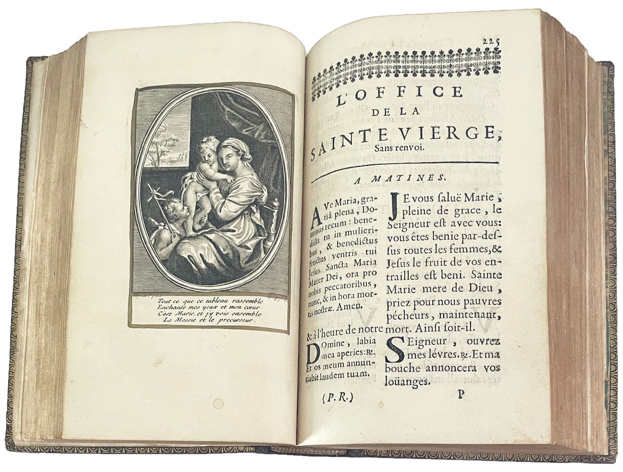 Two parts in one volume, 8vo (198x124 mm). [8], 677, [3], 72 pp., engraved frontispiece and 2 engraved plates (depicting Marie and S. Pierre) by Raimond. Woodcut initials, head- and tail-pieces. Text printed in one or two columns. Nicely bound in contemporary richly gilt brown and red morocco, spine with five raised bands and lettering piece, gilt edges, green silk paste-down and bookmark, flyleaves with a gold ornamental frame (corners slightly worn, traces of silk ties). On the front flyleaves bookplates “Aemiliani De Advocalis camilis Collobiani, Mottalciatae ecc. Vercellis MCMXXVII” and “Voluntate et fato. Ex libris Arturo Dazza”. Slightly uniformly browned, at p. 485 marginal tear affecting the text, at p. 581 loss of paper at the bottom corner not affecting the text. A good copy.