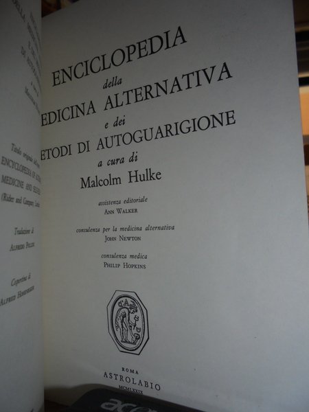 Malcom, Hulke. Roma, Astrolabio, 1979. Enciclopedia della Medicina Alternativa e dei metodi di autoguarigione. In-8°, cartoncino edit. 226, (3) pp. Come nuovo. Uff. stanz. TV. esot.