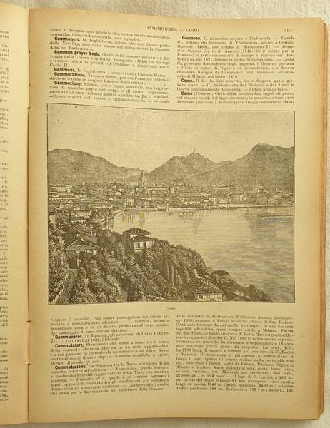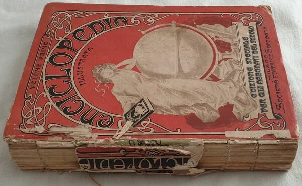 Edizione del 1905 dell'Enciclopedia universale illustrata Sonzogno edita in esclusiva per gli abbonati del "Secolo". Siamo in possesso del volume primo solamente con le lettere A-F. All'interno numerose illustrazioni e vedute: botanica, zoologia, citta (Abbazia di Chiaravalle, Acireale, Adria, Argenta, Aquila, Ascoli, Avignone, Baltimore, Benevento, Bergamo, Belluno, Cagliari, Bologna, Campobasso, Castellammare di Stabia, Fiume ecc.), indigeni africani, americani, calzature, personaggi illustri ecc. In discrete condizioni. Copertina cartonata editoriale in mediocri condizioni con lievi usure ai margini e dorso. Piatto posteriore e dorso assente. Legatura in discrete condizioni con rotture. Pagine in buone condizioni con rare fioriture. In 8. Dim. 26x18,5 cm. Pp. 800.Edition of 1905 of Enciclopedia universale illustrata Sonzogno edited in exclusive for readers of "Secolo". We only have the first volume containing letters A-F. Inside different illustrations and views: botany, zoology, cities (Abbazia di Chiaravalle, Acireale, Adria, Argenta, Aquila, Ascoli, Avignone, Baltimore, Benevento, Bergamo, Belluno, Cagliari, Bologna, Campobasso, Castellammare di Stabia, Fiume ecc.), african and american indigenous, americans, shoes, important carachters. Carton editorial cover in poor conditions lightly worn in the extremities. Back plate and spine lacking. Binding in fair conditions with cracks. Pages in good conditions with occasional foxing. In 8. Dim. 26x18,5 cm. Pp. 800.