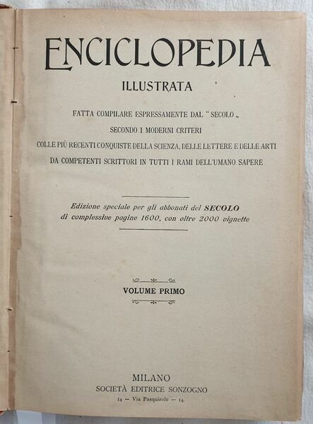 ENCICLOPEDIA ILLUSTRATA FATTA COMPILARE ESPRESSAMENTE DAL "SECOLO" SECONDO I MODERNI CRITERI EDIZIONE SPECIALE PER GLI ABBONATI DEL SECOLO VOLUME PRIMO