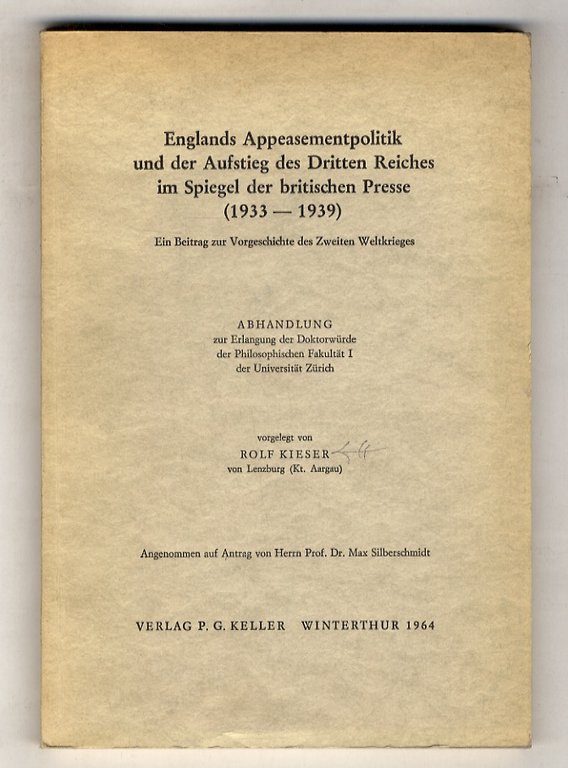 Englands Appeasementpolitik und der Aufstieg des Dritten Reiches im Spiegel der britischen Presse (1933 - 1939). Ein Beitrag zur Vorgeschichte des Zweiten Weltkrieges. Abhandlung zur Erlangung der Doktorwürde der Philosophischen Fakultät I der Universität Zürich.