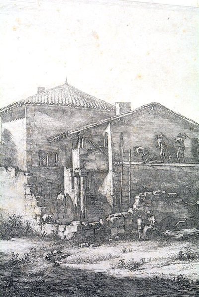 Dimensions: 615(377) x 432(265) mm. Jolie gravure très detaillée d'une scène de renovation d'une bâtisse dans le village de Lantilly en France.