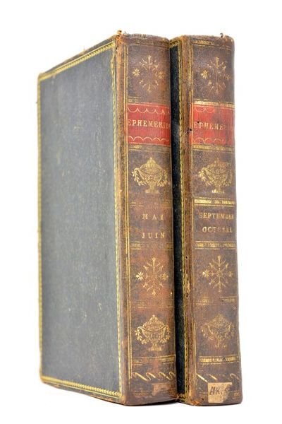 2 volumes. 266 pages. + 244 pages. (20,5x13cm). Pleine basane. Dos lisse orné. Pièce de titre rouge. Décoration dorée en encadrement des plats. Filet doré sur les coupes. Gardes marbrées. Quelques frottements et épidermures sur la reliure. Accidents aux coiffes. Coupes élimées. Coins légèrement épointés. Travaux de ver sur la charnière du plat inférieur (deuxième volume). Très bon état intérieur. 2 volumes particulièrement frais reliés à l'époque dans une pleine basane qui mérite une restauration. Premier volume: Mai-Juin; deuxième volume: Septembre-Octobre.