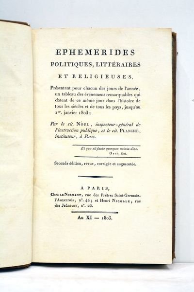 Ephémérides politiques, littéraires et religieuses, présentant pour chacun des jours de l'année un tableau des événemens remarquables qui datent de ce même jour dans l'histoire de tous les siècles et de tous les pays jusqu'à premier janvier 1803. Seconde édition, revue, corrigée et augmentée.