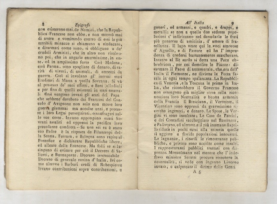 (In fine: Roma, l'anno 1796]), in-8 piccolo, br. muta coeva, pp. 23, [1] (ma 32). Libello antifrancese. Per il probabile A. cfr.: Una Nazione da rigenerare [.]. Napoli 1993, n. 503. Ottimo esemplare. Ex-libris Piero Gerini.