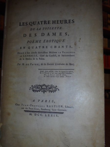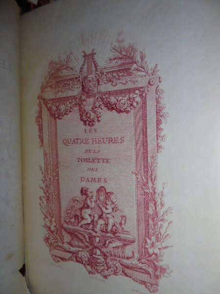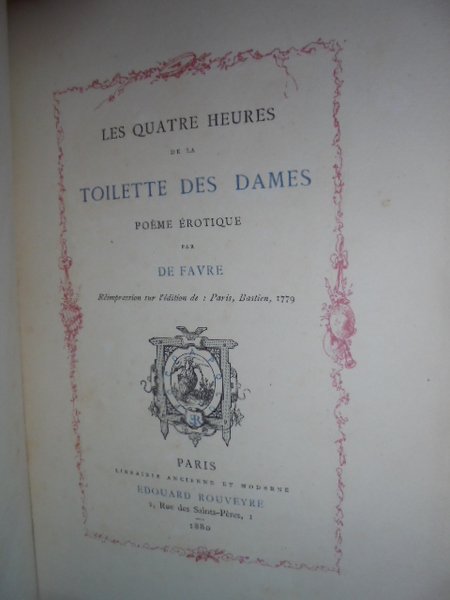 (Erotica) FAVRE (Abate). Paris, Edouard Rouveyre, 1980. Les quatre Heures de la toilette des Dames. Poème érotique. Réimpression sur l' édition de: Paris. Bastien, 1779. In-8°, cart. edit. con 2 sovracopertine (la prima con scotch sul dorso). 91, (1 indice), 5 pp. con 4 belle tavole incise in rame da Halbou, Le Grand, Le Roy, Patas ricoperte da veline. Esemplare numerato (n° 582). Lievi bruniture in 3 pagine ma in buono stato di conservazione. Neg. mob. 4.