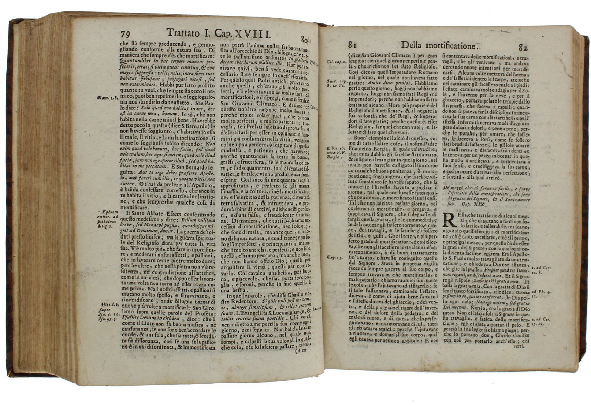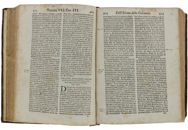 (Codice AN/3266) Tre parti in un volume in 8° (22 cm) VIII-602 colonne + 27 pp.; VI-587 colonne + 18 pp.; VI-486 colonne + 15 pp. Parte prima. Di varii mezzi per acquistare la virtù, e la perfettione - Parte seconda. Dell'esercitio d'alcune virtù appartenenti a tutti quelli, che fanno professione di servir Dio · Parte terza. Dell'esercitio delle virtù appartenenti allo stato religioso, e d'altre cose, che aiutano la perfettione. Tre frontespizi riquadrati, con grande marca tipografica, il primo in rosso e nero. Lievi, normali ingialliture, macchiette, piccolo alone marginale. Legatura del tempo in piena pelle, nervetti, scomparti ornati, titolo oro. Tarlino al dorso, mancanza alla cuffia, lievi abrasioni ai bordi. Ottimo stato. ~~~ SPEDIZIONE IN ITALIA SEMPRE TRACCIATA