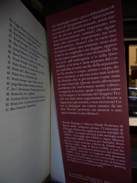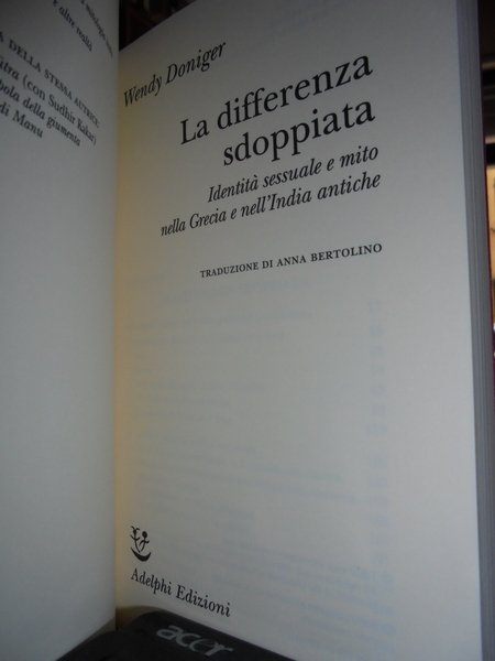 (Esoterismo e Religione) Wendy, Doniger. Milano, Adelphi Edizioni, 2009. La differenza sdoppiata. Identità sessuale e mito nella Grecia e nell' India antiche. Traduzione di Anna Bertolino. In-8°, cartoncino edit. con alette. 428 pp. In stato di nuovo. Neg. esot. mob. 10