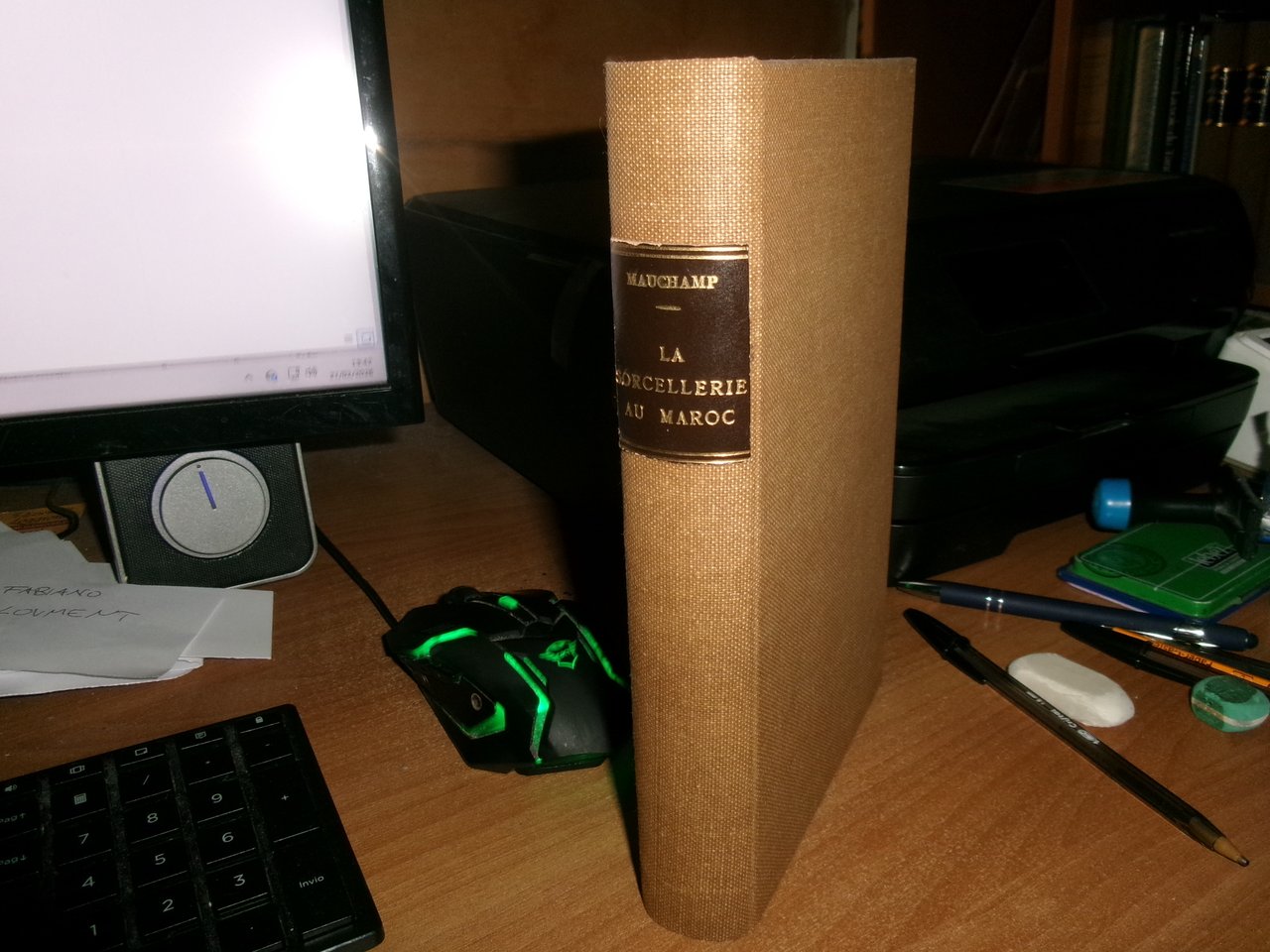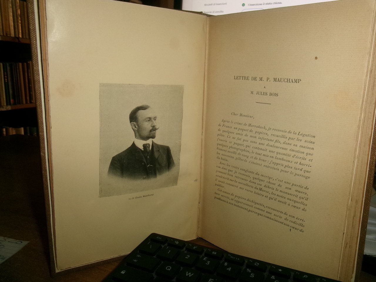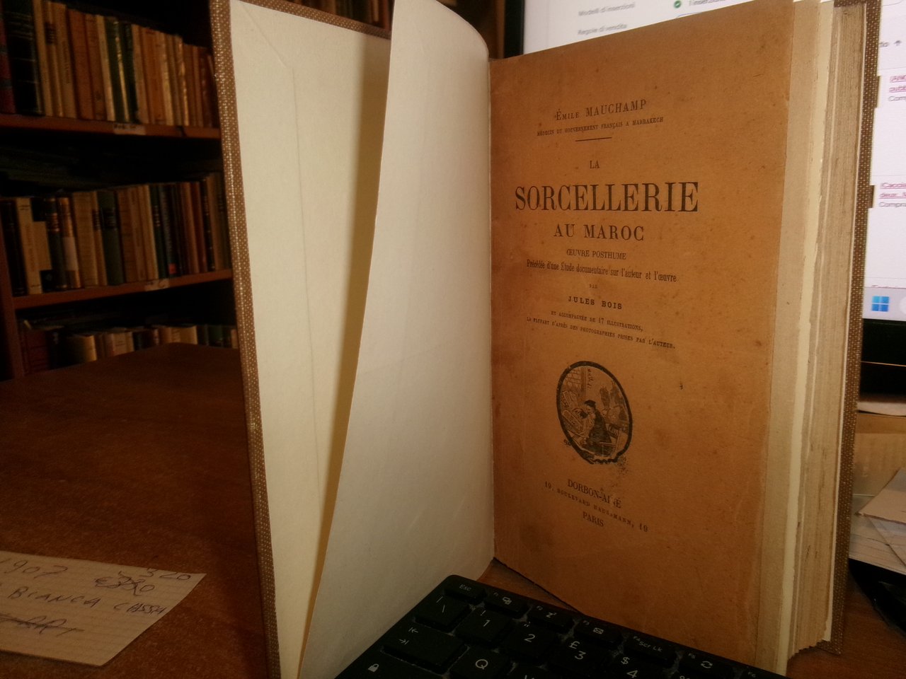 (Esoterismo-Occultismo) Jules, Bois. Paris, Dorbon-Ainé, s.d. (1907). LA SORCELLERIE AU MAROC. Oeuvre posthume précédée d' une étude documentaire sur l' auteur et l' oeuvre. In-8°, tela con titolo in oro entro tassello al dorso, copertine originali conservate. 313,(1) pp. Bell' esemplare. Des obligations de la France “envers le Maroc immoral, ignorant et dégénéré, telles qu’elles découlent des révélations apportés par ce livre” (Jules Bois). L’auteur fut assassiné à Marrakech dans des circonstances restées mystérieuses. Neg. mens. bianca cassa