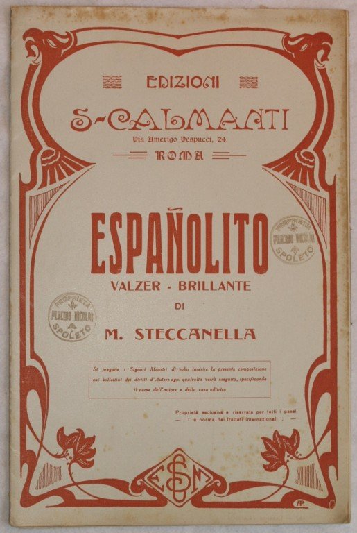 In 8. cm 27x17,5. Pp. 12. Partitura completa per orchestra del 1931 di una canzone. Caratteristica copertina decorata dell'epoca. Ex libris sulla copertina. Ottime condizioni; bruniture in copertina. A complete score for orchestra of 1931. Carachteristic decorated cover of that period. Ex libris in the cover. Very good conditions; brownings in the cover.
