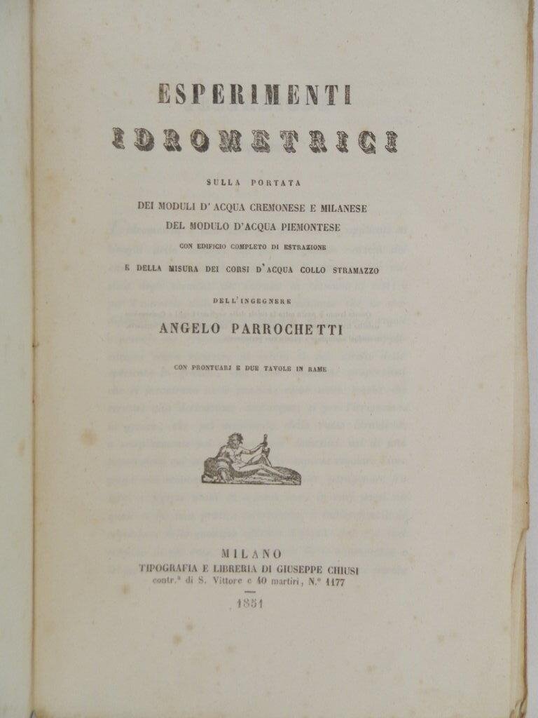 Esperimenti idrometrici sulla portata dei moduli d'acqua cremonese e milanese del modulo d'acqua piemontese con edificio completo di estrazione e della misura dei corsi d'acqua collo stramazzo