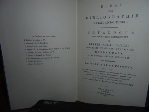 MULLER, F. Amsterdam, N. Israel, 1960. Essai d'une Bibliographie Néerlando-Russe. Catalogue d' une collection remarquable de livres, atlas, cartes, portraits, planches, manuscrits, hollandais, et de plusieurs livres étrangers tous concernant la Russie et la Pologne. In-8° piccolo, tela edit. con titolo in oro al dorso. viii, 174, (2) pp. Ristampa dell' edizione del 1859. Neg. mob. nero 20