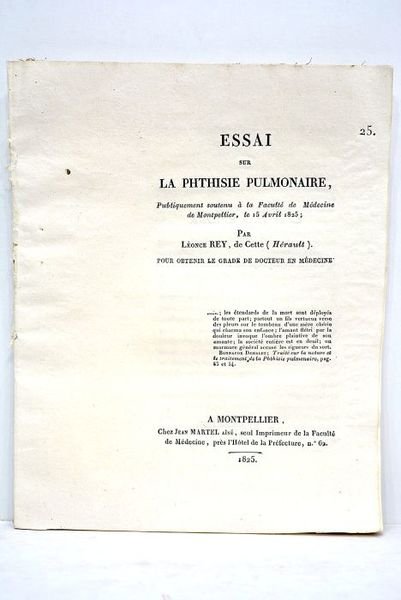Essai de la phtisie pulmonaire, publiquement soutenu à la Faculté de Médecine de Montpellier, le 15 avril 1825.