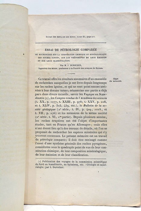 Essai de Pétrologie Comparée ou Recherches sur la composition chimique et minéralogique des Roches Ignées, sur les Phénomènes de leur émission et sur leur Classification.