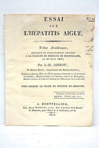 Essai sur l'hépatitis aiguë. Tribut académique présenté et publiquement soutenu à la Faculté de Médecine de Montpellier le 26 août 1825.