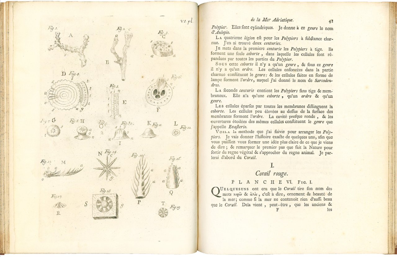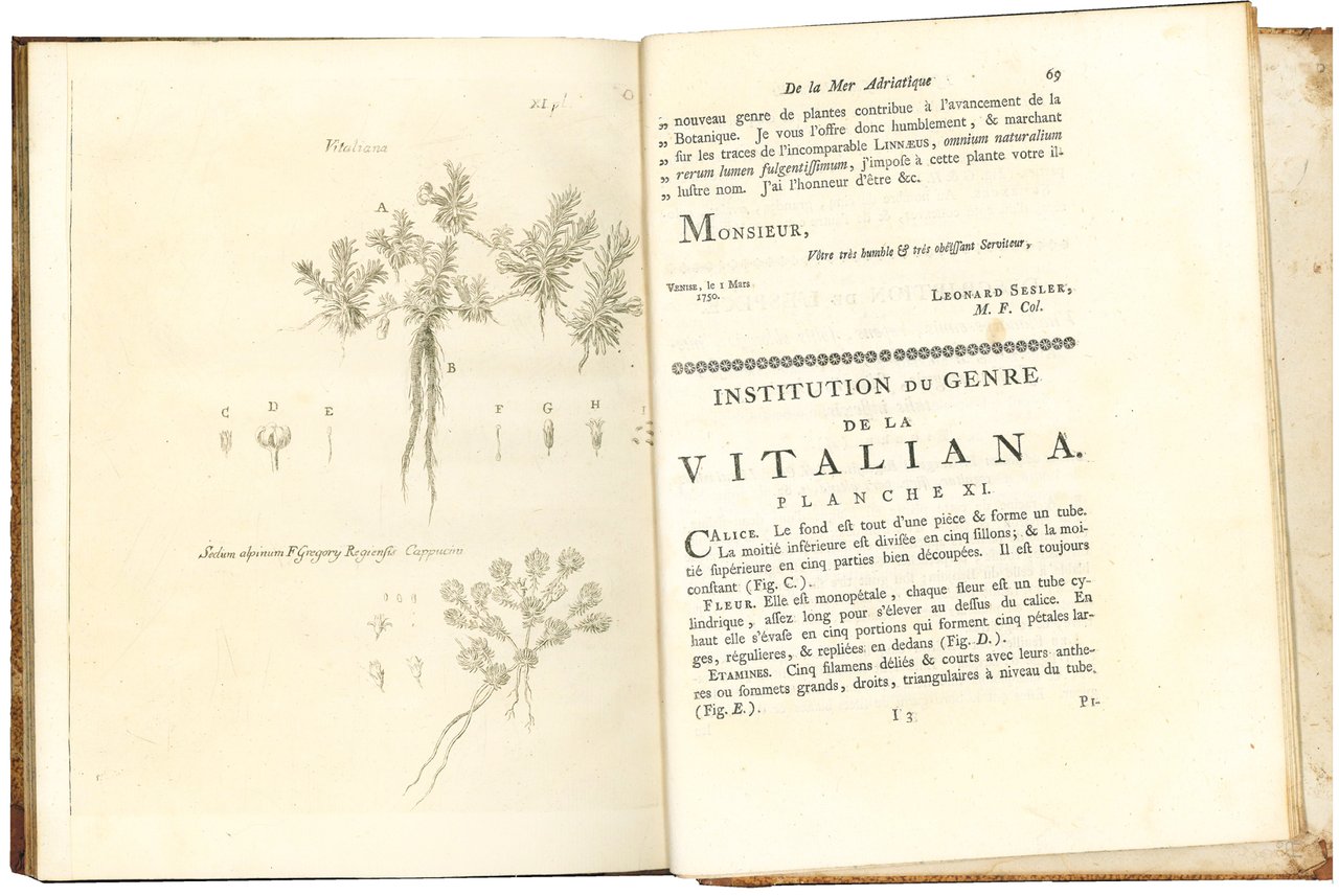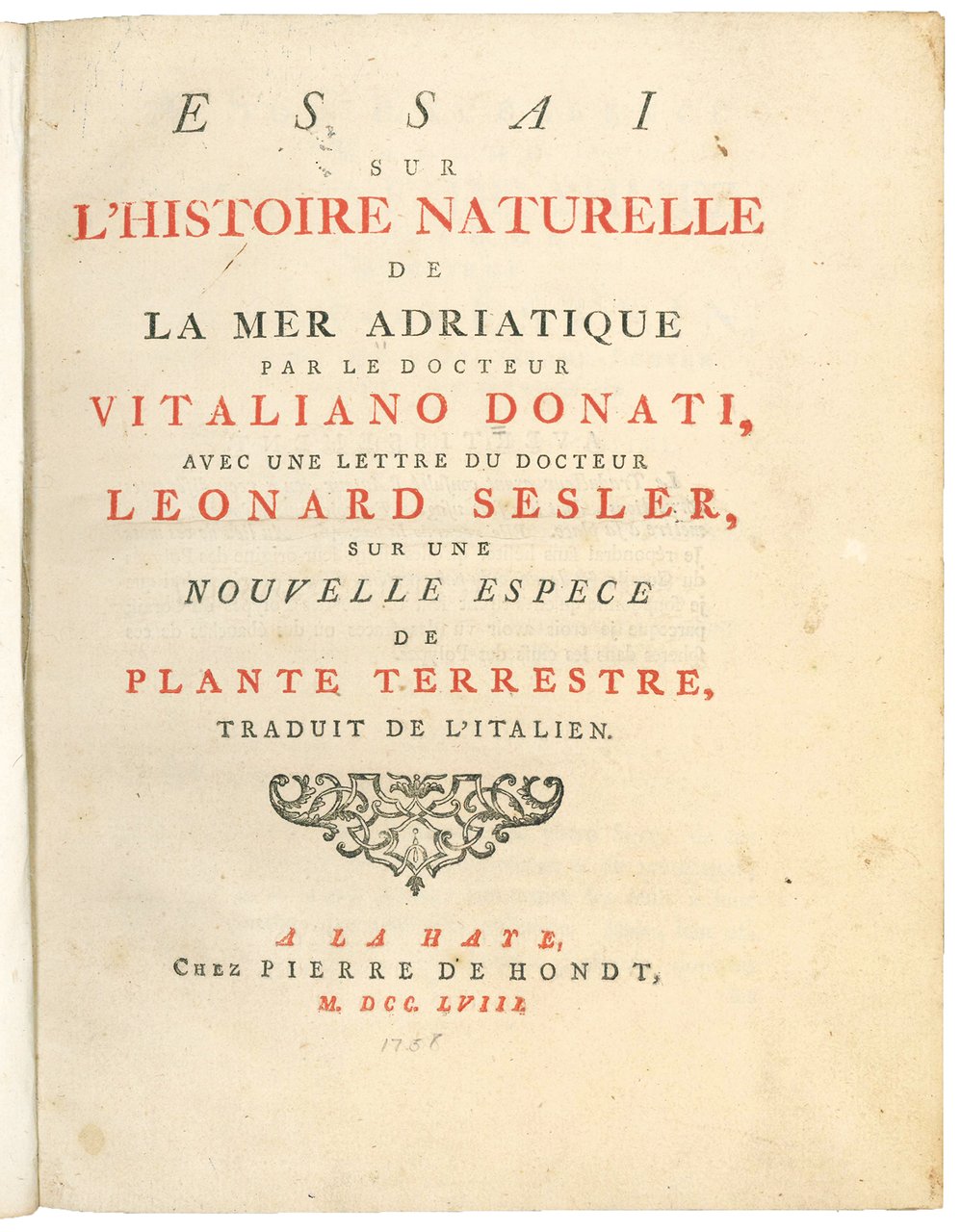 First edition in French, dedicated by the printer to Madame Caroline De Shutz and her husband Monsieur De Grovestein, of Donati's Della storia naturale marina dell'Adriatico with L. Sesler's letter describing the new species “Vitaliana perennis”.