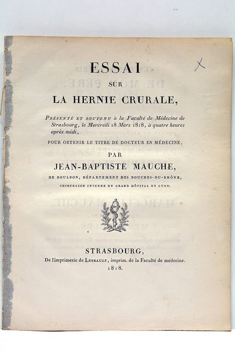 29 pages. (24x19 Cm). Dérelié. Rousseurs claires en marges. Bon état. Jean-Baptiste Mauche est originaire de Boulbon, dans les Bouches-du-Rhône. Essai présenté et soutenu à la Faculté de Médecine de Strasbourg, le Mercredi 18 Mars 1818 pour obtenir le titre de Docteur en Médecine. Rares rousseurs. Document en bon état. Correction à l'encre page 6.