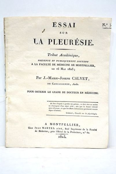 Essai sur la pleurésie. Tribut académique présenté et publiquement soutenu à la Faculté de Médecine de Montpellier le 16 mai 1823.