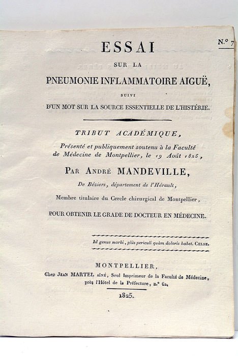 27 pages. (21x17 Cm). Dérelié. Mouillures claires en marges. Mandeville est originaire de Béziers dans l'Hérault. Tribut académique présenté et publiquement soutenu à la Faculté de Médecine de Montpellier le 19 août 1825 pour obtenir le grade de Docteur en Médecine. Essai sur la pneumonie ou inflammation de la substance même du poumon, considérée comme l'une des maladies les plus dangereuses affectant l'humanité.