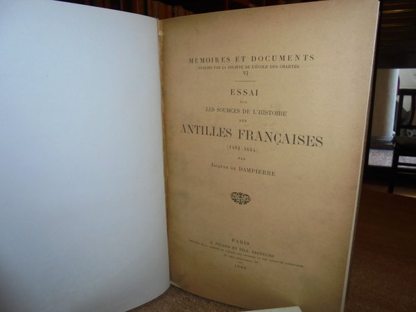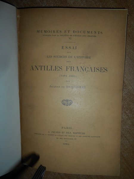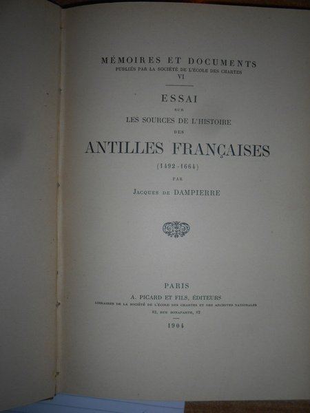 Dampierre , Jacques de. Paris, A. Picard & Fils , 1904. Essai sur les sources de l' histoire des Antilles françaises(1492-1664). In-8°, tela con titolo in oro entro tassello al dorso, copertine originali conservate. XL, 238, (1) pp. Ottimo esemplare. Uff. B - III - 6 - 2