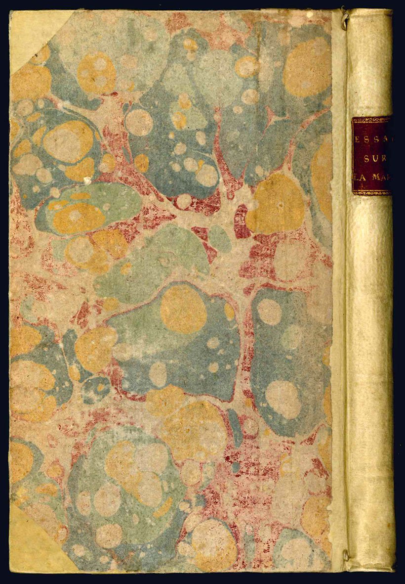 In 8vo (mm 189x117); pp. 176. Carta leggermente ed uniformemente brunita. Mezza pergamena coeva con punte, dorso con tassello e titolo in oro. Piatti rivestiti con carta colorata, tagli gialli. Ex libris su tassello cartaceo, colorato a mano in verde e giallo, applicato al contropiatto anteriore ("Maurocenorum Comitum").