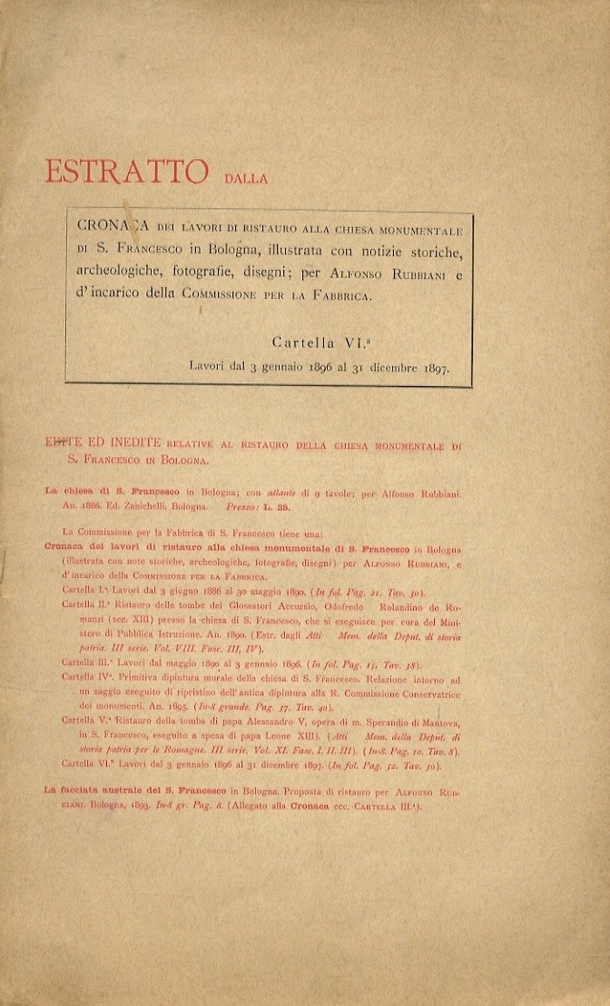 ESTRATTO dalla: Cronaca dei lavori di ristauro alla chiesa monumentale di S. Francesco in Bologna, illustrata con notizie storiche, archeologiche, fotografie, disegni; per Alfonso Rubbiani e d'incarico della Commissione per la Fabbrica. Cartella VI.a. Lavori dal 3 gennaio 1896 al 31 dicembre 1897.