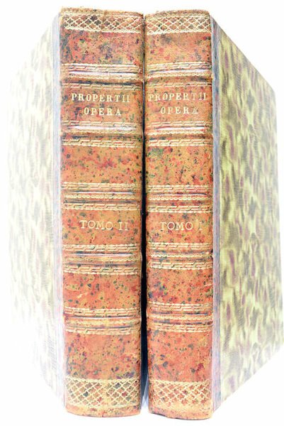 2 volumes. 5 feuillets. 560 pages. + 1 feuillet. page 563-1290. 2 feuillets. (26x21 Cm). Demi-cuir. Reliure postérieur. Dos à nerfs doré. Coins et coiffes émoussés. Rares rousseurs. Très peu d'information existe sur Propertius en dehors de sa propre écriture. Son prénom "Sextus" est mentionné par Aelius Donatus et quelques manuscrits le sites comme "Sextus Propertius". Ce que nous savons est qu'il est à compter parmi les poètes les plus célébrés de son temps. C'est au début des années 20 avant JC qu'il rencontre Cynthia, une dame qui l'inspirera pour exprimer son génie poétique. Propertius publie son premier livre d'élégies d'amour en 25 avant JC, avec Cynthia elle-même comme sujet principale. Dans ces deux imposants volumes Properce commente des ouvrages d'autres poètes contemporains de l'époque. La légende veut que le texte des Elégies ait été découvert dans une cave à vin. Exemplaire en très bon état. Belle page de titre illustrée, imprimée en rouge et noir.