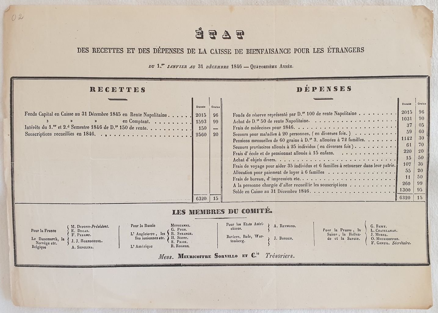 Rarissimo documento, il rendiconto finanziario dell'anno 1846 della Cassa di Carità (Caisse de Bienfaisance) destinata ai cittadini stranieri indigenti che vivevano a Napoli. Il sottoscrittore del documento è il tesoriere Meuricoffre Sorvillo e c. Seguono nomi dei membri del comitato. In ottime condizioni. Rare fioriture. Piegatura verticale.In 4. Dim. 22x31 cm. Pp. (1).Very scarce document the financial resuming of the year 1846 about Fund of Charity (Caisse de Bienfaisance) destinated to stranger people living in Naples. The subscibers of the document the treasurer Meuricoffre Sorvillo e c. Then names of the members of the Comitee In very good conditions. Occasional foxing. Vertical folding. In 4. Dim. 22x31 cm. Pp. (1).