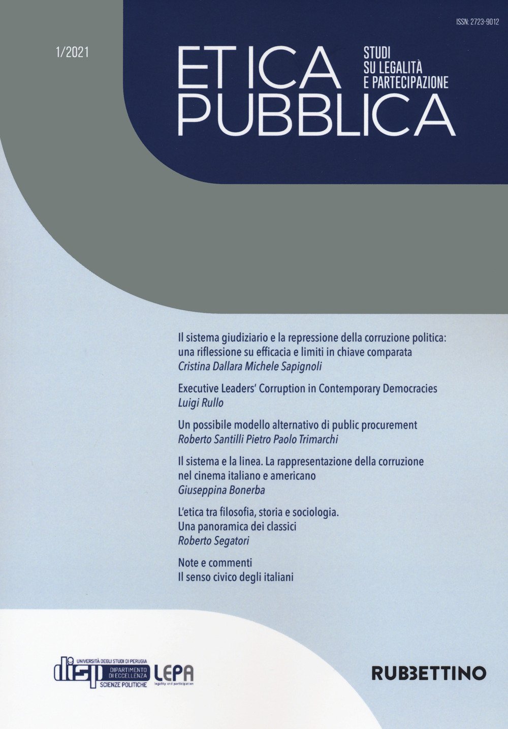La rivista “Etica pubblica. Studi su legalità e partecipazione” nasce all’interno del progetto Lepa (Legalità e partecipazione) grazie al quale il Dipartimento di Scienze Politiche dell’Università di Perugia è stato riconosciuto dal Ministero dell’Istruzione, dell’Università e della Ricerca “Dipartimento di Eccellenza”. La rivista parte da un presupposto principale: la legalità non può essere ridotta ad una questione di repressione. Legalità è soprattutto frutto di idee condivise di bene comune e interesse generale, appunto un’etica pubblica condivisa, che possa prevenire azioni e comportamenti devianti che minacciano e feriscono la convivenza civile. Un’etica pubblica improntata all’interesse generale presuppone nello stesso tempo la partecipazione attiva dei cittadini per la difesa e lo sviluppo di tali presupposti. È un’etica che fa sentire i cittadini parte decisiva ed attiva della comunità stessa. La rivista intende diventare luogo di dibattito e di promozione di queste idee. Ospita quindi contributi diversi, da quelli filosofici a quelli storici, da quelli giuridici a quelli sociologici, da quelli economici a quelli politologici che possano contribuire a sviluppare e a divulgare una più diffusa cultura dell’interesse generale indagandone, con un approccio scientifico, le origini, i presupposti, le modalità operative nei diversi ambiti della struttura sociale.