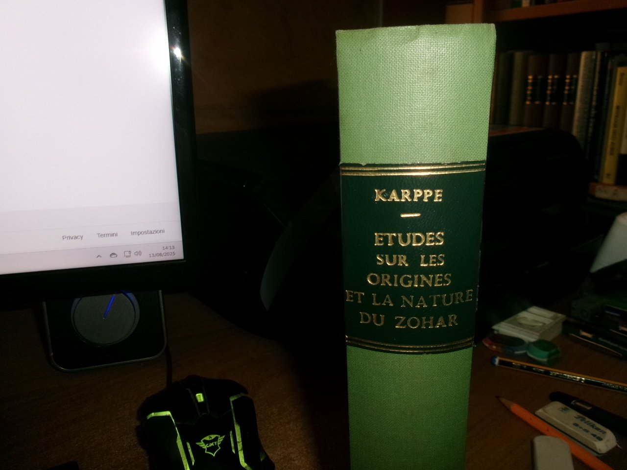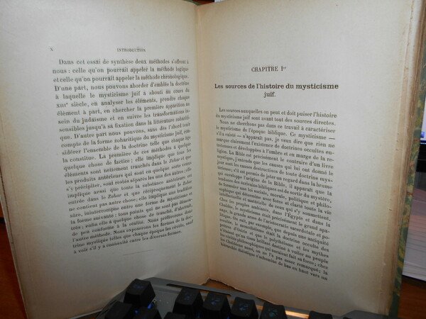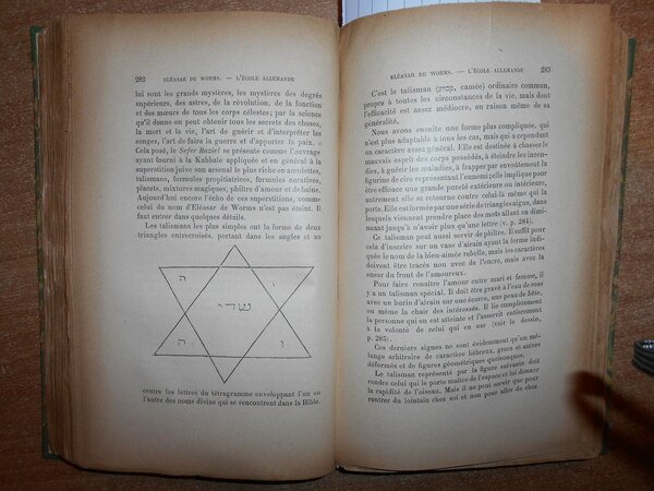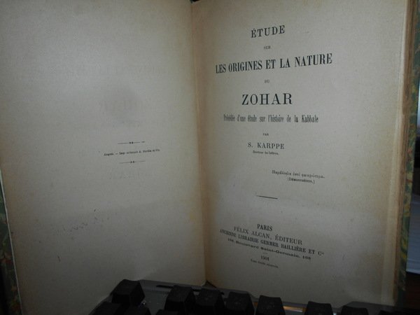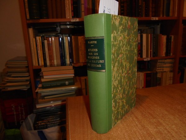 S. KARPPE. Paris, Félix Alcan éditeur, 1901. ETUDE sur LES ORIGINES et LA NATURE du ZOHAR. Précédée d' une étude sur l' histoire de la Kabbale. In-8°, m. tela verde con punte, titolo in oro entro tassello al dorso. (vi), x, 604 pp. con 6 illustrazioni nel testo. Edizione originale molto rara. Bell' esemplare con barbe. Neg. mens. bianca cassa